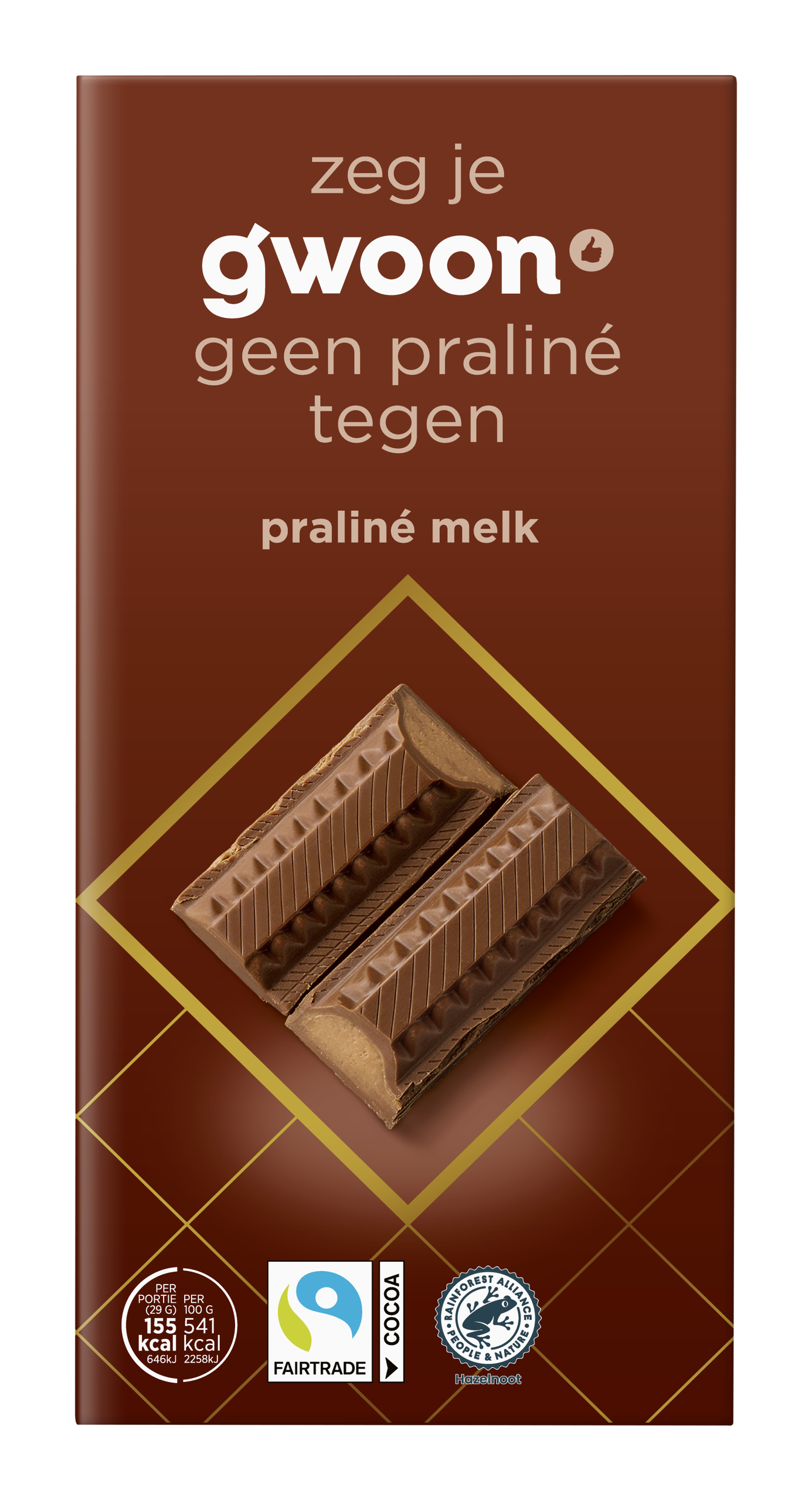 - Melkchocolade met hazelnoot-, amandel- en cashewnootpralinévulling (48 %).