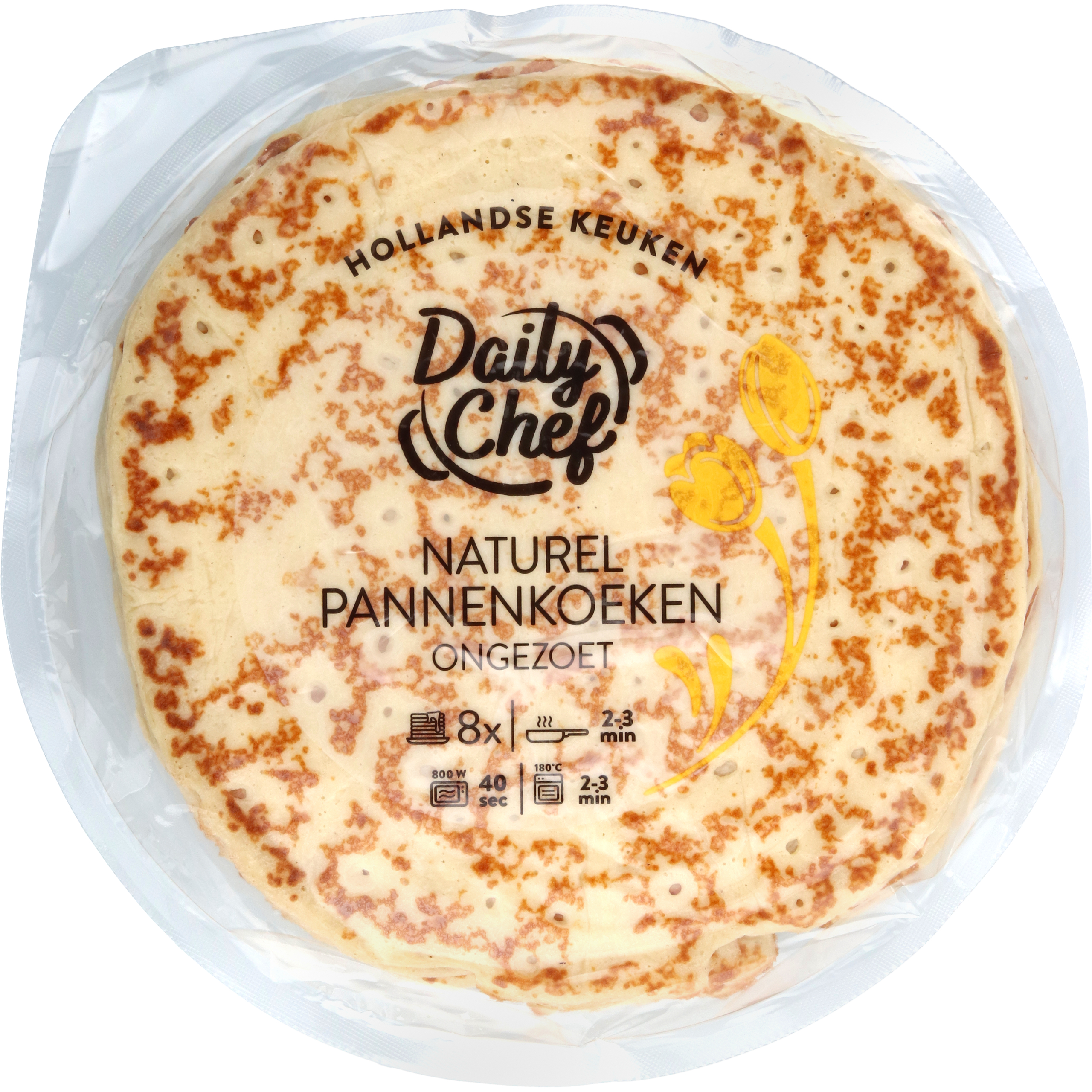 Haal voor het afbakken de pannenkoeken uit de verpakking. Pan: klontje boter/olie toevoegen, af en toe flippen.