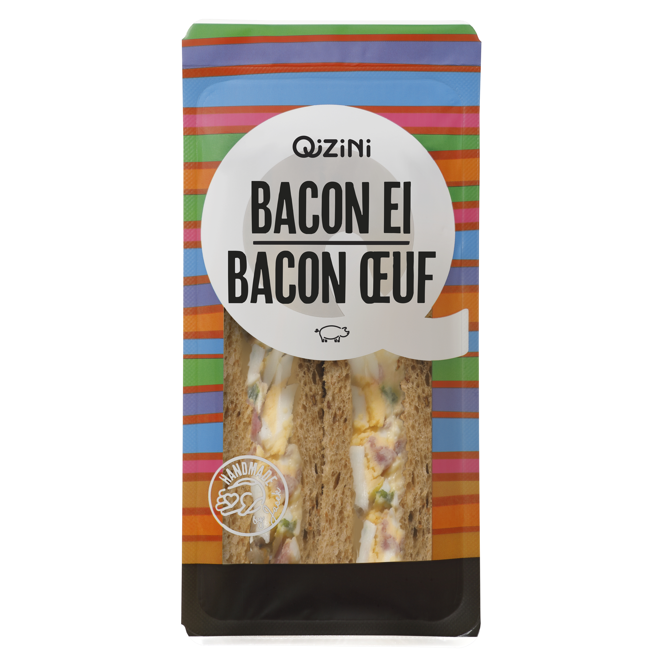 Ingrediënten: 41% wit tarwebrood (TARWEBLOEM, water, lijnzaad, zonnebloempitten, GERSTEMOUTMEEL, raapzaadolie, gist, bakkerszout, TARWEGLUTEN), 36% gekookt ei (EI*, zout, voedingszuur: azijnzuur/citroenzuur, zuurteregelaar: natriumacetaten), 8% uitgebakken ontbijtspek stukjes (95% varkensvlees, zout, antioxidant: natriumascorbaat, conserveermiddel: natriumnitriet, rook), 8% sla dressing met zwarte peper (raapzaadolie, water, brandewijnazijn, EIGEEL*, gemodificeerd aardappelzetmeel, suiker, zout, mosterd [water, MOSTERDZAAD, brandewijnazijn, zout, suiker, specerijen], 0,8% zwarte peper, verdikkingsmiddel: xanthaangom, MOSTERDZAAD, witte peper), 7% slasaus (water, 25% raapzaadolie, maiszetmeel, suiker, EIGEEL*, brandewijnazijn, gemodificeerd maiszetmeel, zout, verdikkingsmiddel: guarpitmeel), 0.2% gedroogde bieslook, natuurazijn, zout, water, zwarte peper, conserveermiddel: kaliumsorbaat. *scharreleieren